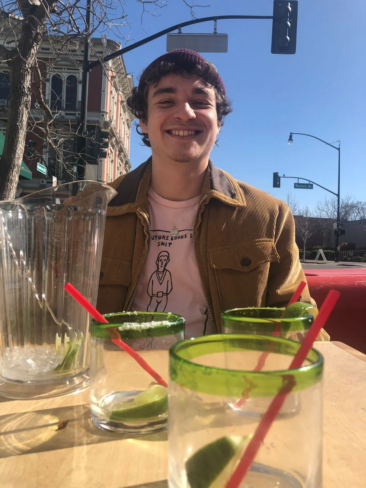 Miles proudly wearing his Dan Reeder “the future looks like shit” t-shirt, 3 margs in on his 21st birthday.